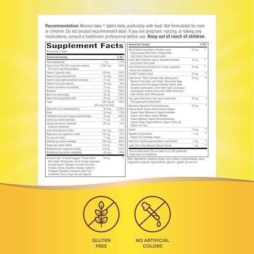 Support multiple body systems after age 50.* Nature’s Way Alive! Women’s 50+ Ultra Multivitamin contains 200% or more Daily Value of 10 vitamins and minerals women need. The once-daily formula is designed to support healthy brain function, heart health, bone health, and more.* High potency vitamins C and E and selenium provide antioxidant support.* Women’s 50+ Ultra Potency Multivitamin also contains plant-based blends like Orchard Fruits & Garden Veggies (60 mg per serving), Cardio, Mind & Body Energy, and Daily Greens. Gluten-free with no artificial colors.*This statement has not been evaluated by the Food and Drug Administration. This product is not intended to diagnose, treat, cure, or prevent any disease.