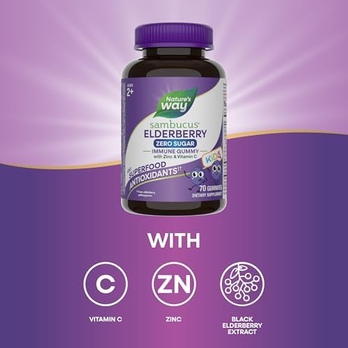 Nature’s Way Sambucus Zero Sugar Elderberry Immune Gummies for Kids, Immune Support*, with Vitamin C, Zinc, Black Elderberry Extract, 70 Count (Packaging May Vary)