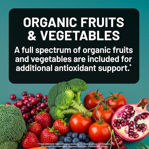 ORGANIC FRUITS & VEGETABLES: A full spectrum of organic fruits and vegetables are included for additional antioxidant support, including organic: cranberry, strawberry, raspberry, broccoli sprouts, spinach, kale, & more.