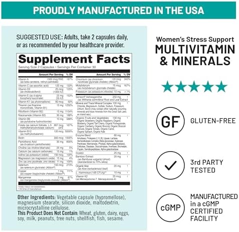 Women’s Multivitamin with Stress Support provides comprehensive support for women’s health. This unique whole food complex multivitamin provides deep nourishment for key aspects of women’s health with 24 vitamins and minerals to support heart health, immunity, and healthy hair, skin, and nails.* Rich with herbal ingredients and antioxidants, NatureWise Women’s Multivitamin meets the key dietary needs of women to feel their best.* Among the 24 vitamins and minerals in this formula are vitamin A, C, D3, E, K2, B-complex, calcium, magnesium, zinc, and more. This multivitamin goes beyond the standard formula with the addition of organic fruits and vegetables, such as strawberry, blueberry, raspberry, kale, broccoli, and more. We also added digestive enzymes which aids the digestion of starches, protein, fats, and fiber to promote nutrient absorption.* On top of its robust vitamin complex, this formula is designed for stress support with its dose of Sensoril® Ashwagandha. Ashwagandha may support a healthier stress response while encouraging a balanced mood and emotional well-being.* Support your daily health and address your body’s stress responses with this premium Women’s Multivitamin. This product is vegetarian, gluten-free, and does not contain wheat, eggs, soy, dairy, tree nuts, peanuts, fish, or shellfish.