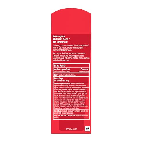 2-ounces of Neutrogena Stubborn Acne AM Treatment with 2.5% Benzoyl Peroxide, a dermatologist proven ingredient, works all day to help eliminate stubborn breakouts and reduce redness