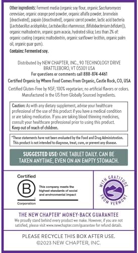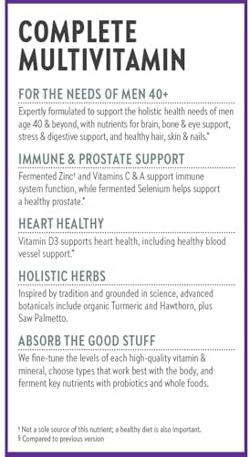 If you’re looking for the right multivitamin for men over 40, New Chapter has got you covered with this one-daily, nutrient-packed formula for energy support, immune, heart, eye, and prostate health, and so much more.* Enhance your overall wellness with essential vitamins and minerals fermented with probiotics, and formulated for your body to recognize and absorb as food. Our easily digestible multivitamins for men 40 plus are gentle even on an empty stomach. Here at New Chapter, we sustainably source the highest quality ingredients and craft with you and our planet in mind. We do all this, so you can do you. That’s wellness, well done. *These statements have not been evaluated by the Food and Drug Administration. This product is not intended to diagnose, treat, cure or prevent any disease.