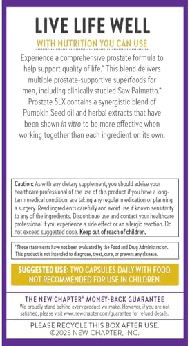 Prostate 5LX™ is a daily prostate supplement expertly formulated to support normal urine flow and overall prostate health.* It combines multiple prostate-supportive plant nutrients from Nettle, clinical- strength Saw Palmetto, Pumpkin Seed, and other potent herbs.* New Chapter’s premier prostate supplement is also rich in fermented Selenium, a key mineral for men. The benefits of New Chapter’s Prostate 5LX add up to a comprehensive men’s formula that supports your quality of life—day and night.* *These statements have not been evaluated by the Food and Drug Administration. This product is not intended to diagnose, treat, cure, or prevent any disease.