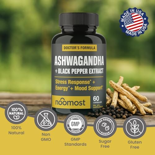 NooMost Ashwagandha Root Extract 15:1 with Black Pepper for Better Absorption – 60 Capsules – Natural Stress, Energy, Focus & Sleep Support – Adaptogen Supplement for Men & Women – Made in USA
