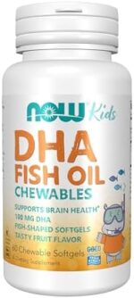 NOW® Kids Chewable DHA comes in fish-shaped softgels with a tasty fruit flavor. This supplement has 100 mg DHA per serving and supports brain health.* This natural fish oil concentrate is manufactured under strict quality control standards. It is tested to be free of potentially harmful levels of contaminants such as PCBs, dioxins, mercury, and other heavy metals.