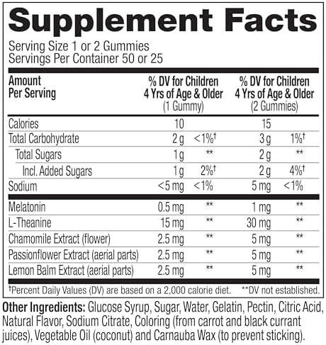 HOW TO TAKE: Ages 4 and up, start with 1 gummy and give up to 2 gummies as needed 30 minutes before bedtime. Chew thoroughly before swallowing.