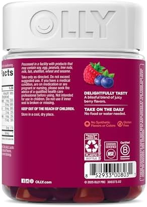 Go big with OLLY Women’s Multi gummies, a delicious, scientifically formulated, gluten free gummy vitamin for health and wellness. Our Blissful Berry flavor with other natural flavors gummy vitamins for women include nutrients to nourish you daily so you can keep doing your thing. This womens multivitamin blend features B Vitamins to support cellular energy, Vitamin D to support bone health* and Vitamins A, C & E. The chewable daily vitamins are a blend for overall wellness and to help fill the gaps when your eating habits are a little less than perfect.* We’ve made it our mission to champion better wellbeing, for all. We do it by crafting products that are as effective as they are delicious—because we know when something feels good, you’re more likely to do it.* *These statements have not been evaluated by the Food and Drug Administration. This product is not intended to diagnose, treat, cure or prevent any disease.