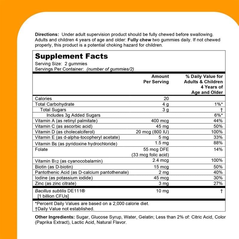 Support your little ones’ digestive health* with One A Day Kids Multivitamin Probiotic, our tasty vitamins for kids ages 4+ contain a clinically tested probiotic for kids. Your kids will love our naturally flavored orange gummy vitamins—and you’ll love that they’re free of artificial sweeteners, artificial flavors, high fructose corn syrup and egg, fish/crustacean shellfish, gluten and dairy (milk) allergens. One A Day multivitamin for kids includes 1 billion CFUs of Bacillus subtilis DE111 probiotic per serving (2 gummies) to support gut health as well as Vitamin D and Vitamins C, E and Zinc to support immune health, Vitamins A, C, and E to support eye health and Vitamins B6 and B12 support brain health. So, try One A Day kids multivitamin with probiotic gummies to help your kids fill nutritional gaps and support digestive health, brain health, bone health and immune health.* *This statement has not been evaluated by the Food and Drug Administration. This product is not intended to diagnose, treat, cure, or prevent any disease