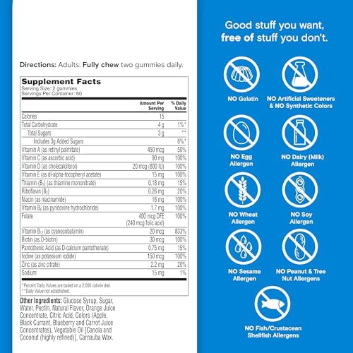 Add daily nutritional support to your healthy lifestyle with One A Day Men’s Daily Essentials Multivitamin Gummies that are specially formulated to meet the unique nutritional needs of men. Our men’s multivitamin provides key nutrients to support immune health, healthy muscle function, bone health, healthy brain function, physical energy(1), cell health, healthy nerve function, skin health and eye health.* Our men’s multivitamin gummy is a delicious way to get Vitamin A, Vitamin E, Vitamin B6, Vitamin B12, Vitamin C and Vitamin D. One A Day Men’s Daily Essentials Multivitamin Gummy vitamins are free of wheat, dairy (milk), egg, soy, sesame, peanuts, tree nut, fish/crustacean shellfish allergens, gelatin, artificial flavors, colors and sweeteners. Add these vitamins for men to your daily lifestyle to help be your best self. (1) With B Vitamins to help your body convert food to fuel *This statement has not been evaluated by the Food and Drug Administration. This product is not intended to diagnose, treat, cure, or prevent any disease.