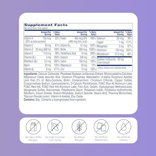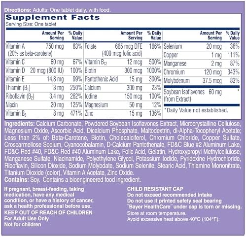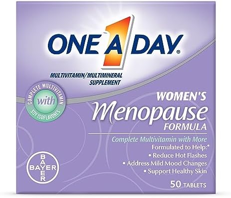 One A Day Women’s Menopause Multivitamin Formula offers key benefits in a convenient tablet, including menopause support: helps reduce hot flashes with Soy Isoflavones.* Our menopause multivitamin for women contains key nutrients to help support bone health.* This daily multivitamin includes Vitamins A, B6, B12, C, D, and E, Thiamin, Niacin, Riboflavin, Folic Acid, Pantothenic Acid, Calcium, Magnesium, Zinc, Copper, Manganese, Molybdenum, Biotin, Iodine, Selenium, Chromium, also includes Soy Isoflavones. One A Day Women’s Menopause Formula is formulated to help reduce hot flashes with Soy Isoflavones, and to provide nutritional support for bone health, physical energy with B vitamins to help convert food to fuel, skin health, and heart health(1).* Adult women take one tablet daily, with food. One A Day Multivitamins can provide nutritional support that you and your family may need at every life stage. (1) Not a replacement for heart medications *This statement has not been evaluated by the Food and Drug Administration. This product is not intended to diagnose, treat, cure, or prevent any disease.