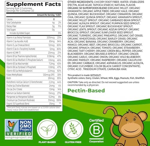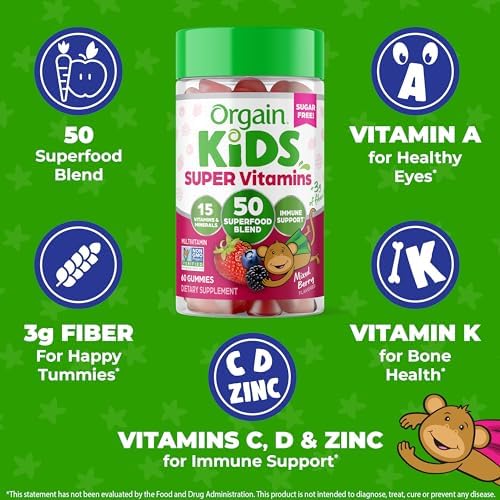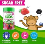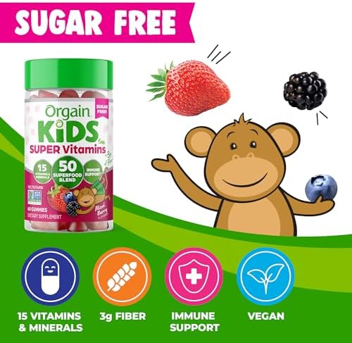 Orgain Kids Sugar Free Multivitamin Gummies, Vegan & Plant Based, 50 Superfoods, 15 Vitamins and Minerals, Immune Support and 3g of Fiber, Mixed Berry, Ages 4+, 1 Month Supply (60 Gummies)