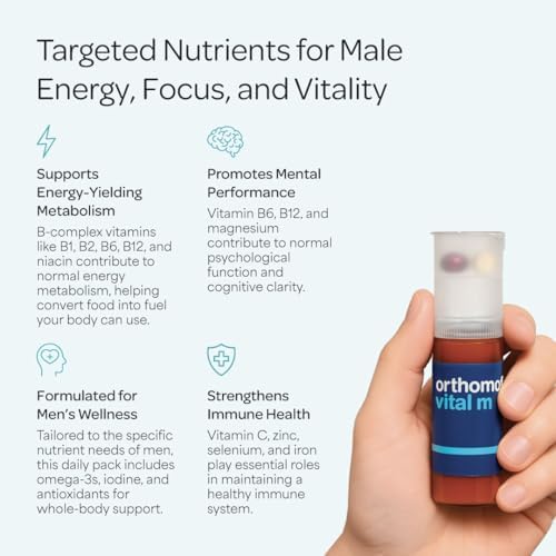 COMPLETE MEN’S MULTIVITAMIN SUPPORT , Orthomol Vital M is a premium daily multivitamin supplement for men, formulated with vitamins A, C, D3, E, K, B-complex, zinc, iodine, and omega-3 to support vitality, immune health, and overall wellness.