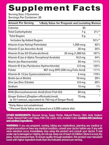 Each fun-to-take gummy serving is packed with delicious fruit flavors and provides B vitamins like Niacin, B6, B12, and Biotin, plus Ginger, Zinc, and vitamins A, C, D, and E. These great-tasting multivitamin gummies for women are an enjoyable way to get daily support before, during, and after pregnancy.