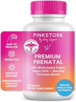 Pink Stork Premium Prenatal Vitamins for Women – Organic Whole-Food Blend with Methylated Folate, Choline, Iron & Vegan DHA – Doctor-Formulated Multivitamin & Probiotic – Gentle on Stomach, 60 Count
