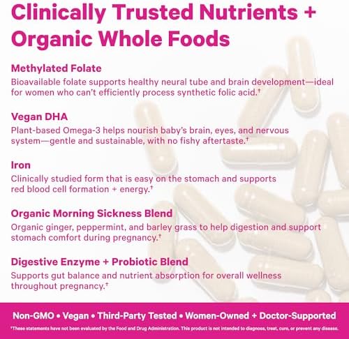 Home Women health Prenatal care Pink Stork Premium Prenatal Vitamins for Women – Organic Whole-Food Blend with Methylated Folate, Choline, Iron & Vegan DHA – Doctor-Formulated Multivitamin & Probiotic – Gentle on Stomach, 60 Count