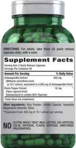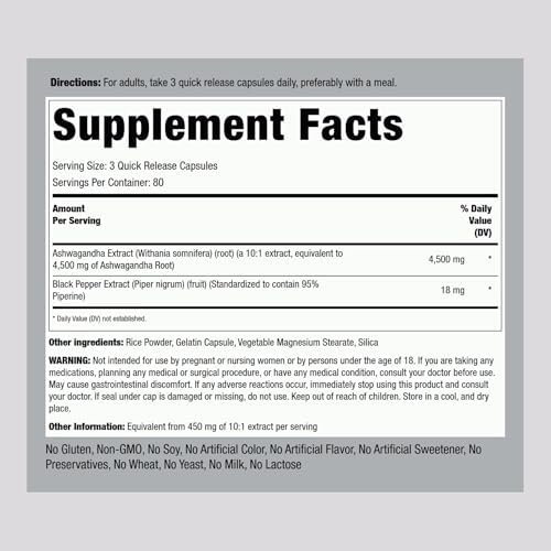 Our quick-release capsules are scientifically crafted, supplying the equivalent of 4,500 mg of Ashwagandha plus Black Pepper Extract for optimal absorption. Our supplement is gluten-free and made without preservatives as well.