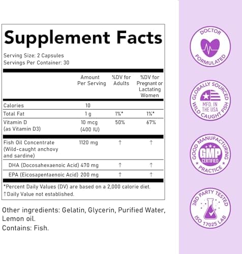 Omega 3 Fatty Acid for Pregnancy – Our omega 3 fish oil contains 1,120 mg total marine lipid concentrate containing 470mg DHA & 200 mg EPA with added 10 mcg (400 IU) of Vitamin D that may be important for fertility.