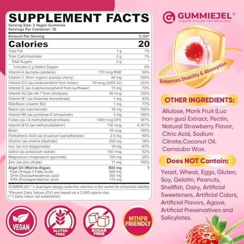 👍20-in-1 Complete Prenatal Support: Prenatal vitamins for women gummies are designed for mom & baby, our science-backed formula delivers essential nutrients including Methylfolate, Algae Omega-3 (DHA/EPA), Choline, Iron, Vitamin A, C, D3, E, K2, 8 B Vitamins, Iodine, Magnesium, Zinc. Perfect for before, during, and after pregnancy! Featuring our innovative GUMMIEJEL dual-layer design for enhanced nutrient stability, absorption, and taste—making your daily prenatal routine delicious & effective.