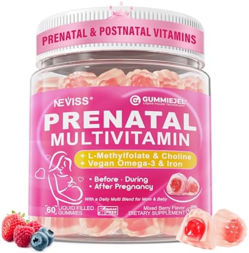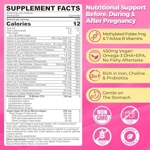 Prenatal Vitamins for Women Multivitamin Gummies w/ Methylfolate 1mg, Choline Omega-3(DHA+EPA) Iron, Postnatal Vitamins for Women Breastfeeding | Before,During & After Pregnancy,Sugar Free,Vegan,60Cts