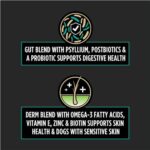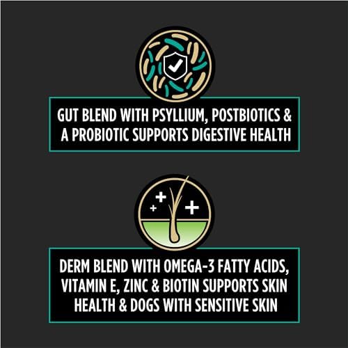 Dog food supplements, made with a gut blend containing psyllium, postbiotics, and a probiotic to support digestive health