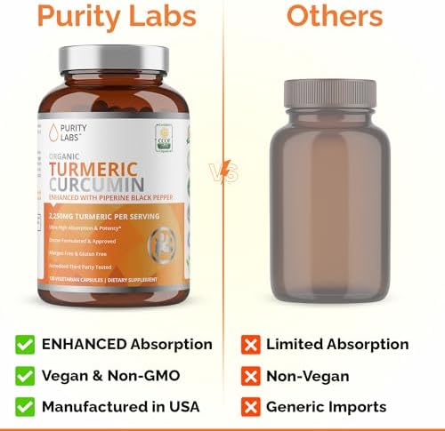 HIGHEST POTENCY: Purity Labs’ high-strength Organic Turmeric Supplements deliver triple-action support with organic turmeric with black pepper for enhanced absorption. This pure, plant-based formula helps reinforce anti inflammatory response and promotes joint support through natural cellular defense. Crafted with care, it’s designed to elevate whole-body wellness using only the finest joint-loving ingredients