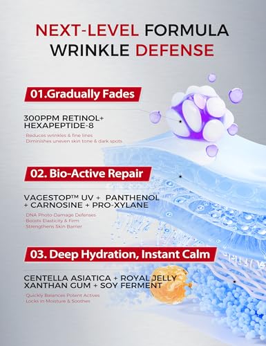 【Powerful Wrinkle Fighters with Retinol & Peptides】Formulated with pure Retinol, and Acetyl Hexapeptide-8, this retinol serum for face targets fine lines and deep wrinkles. Retinol promotes cell renewal and collagen production, while peptides smooth dynamic wrinkles and boost elasticity. A must-have peptides serum for face to fight signs of aging early and gently. With Low-irritation 300 PPM of key actives, this retinol serum for face is a gentle entry point for retinol beginners.
