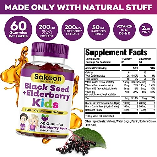 WORLD’S FIRST BLACK SEED + ELDERBERRY FOR KIDS – Gives young girls and boys ages 4+ rich 200mg natural nutrition they may be missing. Black Seed Oil is a legendary superfluous rich in Essential Fatty Acids including Omega 3,6 and 9. It’s a powerful antioxidant that supports healthy hair, skin and joints. Essential for picky eaters and healthy immune support. Delicious Berry Flavor Gummies all kids love.