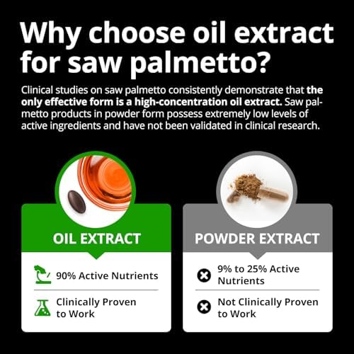 🌙 Pharmaceutical Grade 100% Extract —— Our saw palmetto is sourced from Florida and its extract exceeds the United States Pharmacopeia (USP) standards for medicinal-grade saw palmetto. Formulated to meet clinical research specifications of 320mg, 85% fatty acid content, and 100% oil extract, it delivers optimal potency. The active nutrients in saw palmetto are concentrated in the plant’s oil. Our extract is 7-10 times more potent than standard saw palmetto supplements, which typically contain only 8%-12% oil content