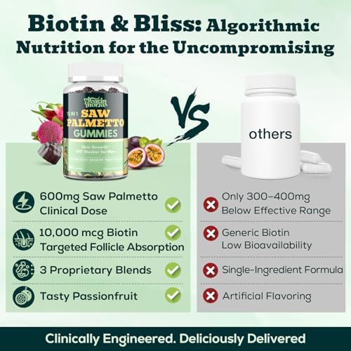 Reclaim Your Reflection — Fortified DHT Defense in Every Gummy. It’s more than hair—it’s about how you see yourself. Each gummy delivers 600mg Saw Palmetto, 10,000mcg Biotin, and a science-backed blend of Green Tea and Quercetin to address what’s standing between you and thicker, fuller strands. Strengthened with Zinc and Vitamin D, this is your daily formula to face the mirror with pride—and confidence you can feel.
