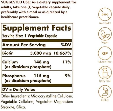 Solgar Biotin 5000 mcg – Promote Healthy Skin, Nails & Hair – Supports Energy Production, Protein, Carbohydrate & Fat Metabolism – Vitamin B – Non GMO, Vegan, Gluten Free – 100 Servings, Unflavored, Standard Packaging, 100 Count