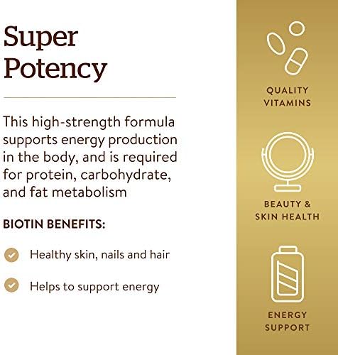 Solgar Biotin 5000mcg helps support healthy hair, nails, and skin; Biotin is necessary for certain enzymes to work properly; these hair, skin, and nails vitamins for women and men alike provide beauty supporting benefits