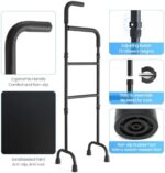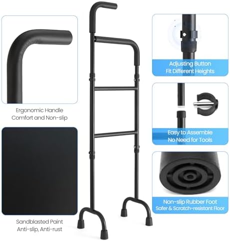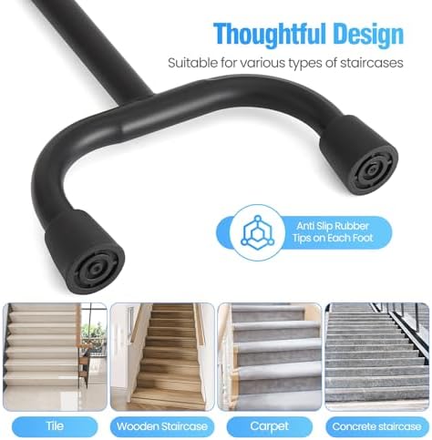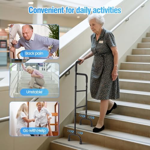 Stair helper for elderly, stair cane for stairs – robust carbon steel frame ensures stability on stairs/flat ground. Non-slip rubber tips grip wood/tile/carpet; reinforced plastic sleeve boosts safety (do not remove). Supports 300 lbs, reliable for daily use.