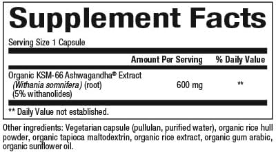 600 mg of organic KSM-66 ashwagandha root extract: Helps support your mind and body during stressful times;* Promotes focus and reaction time;* Promotes cognitive health, mood, fatigue endurance and vitality*