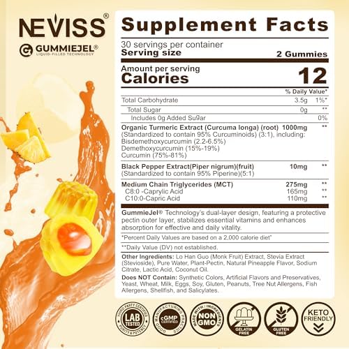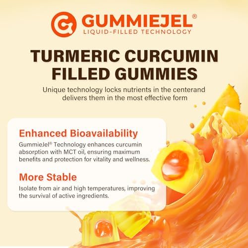 【Unique GummieJel Technology】Neviss turmeric gummies feature a gelatin-free chewy outer layer with a liquid center, preserving 98% curcumin activity. The inner liquid delivers curcumin, MCT oil, and black pepper extract in their most absorbable form, while the pectin shell shields them from pH, oxygen, and temperature effects. This innovative approach ensures optimal absorption and promotes overall vitality.