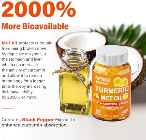 【HIGHTER ABSORPTION & BIOAVAILABILITY】Curcumin is fat-soluble, and its absorption can be enhanced in the presence of fat. That’s why our Turmeric Gummies are standardized to contain 95% curcuminoids combined with medium chain triglyceride (MCT) oil and black pepper extract. C8 and C10 MCTs provide a source of fat and fast energy that helps dissolve curcumin and increases its absorption by 183%, while the addition of black pepper makes it 2000% more bioavailable than regular turmeric alone.