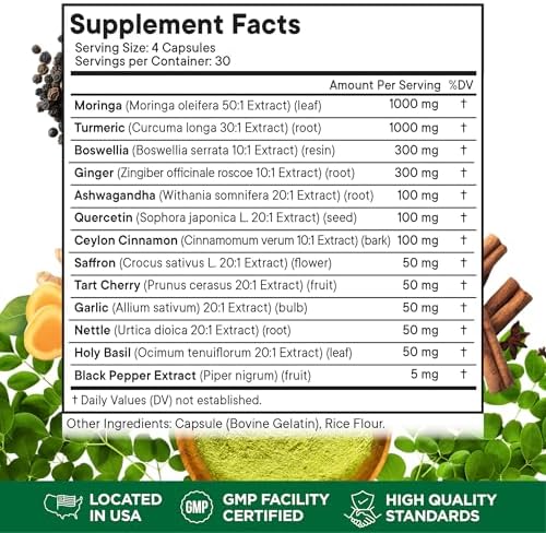 Introducing the All-In-One Holy Basil Supplement – This comprehensive formula includes not only Turmeric and Ginger, but also Moringa Powder Capsules, Boswellia Powder, Ashwagandha, Quercetin, Ceylon Cinnamon, Saffron Extract, Tart Cherry, Garlic, Nettle, Holy Basil, and Black Pepper Extract. It offers a potent alternative to standard Turmeric with Black Pepper supplements, Turmeric Gummies, Turmeric and Ginger Gummies for Adults, and Ginger Pills.