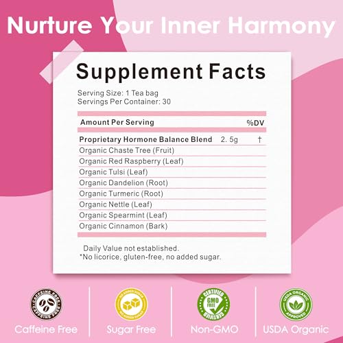 Comprehensive Hormone Balance for Women: This hormone balance tea formulated with organic chasteberry, red raspberry leaf and tulsi, this herbal tea helps naturally support hormone harmony throughout every phase of womanhood. Support PCOS and PMS, it may help regulate menstrual cycles, ease discomfort and promote emotional balance.