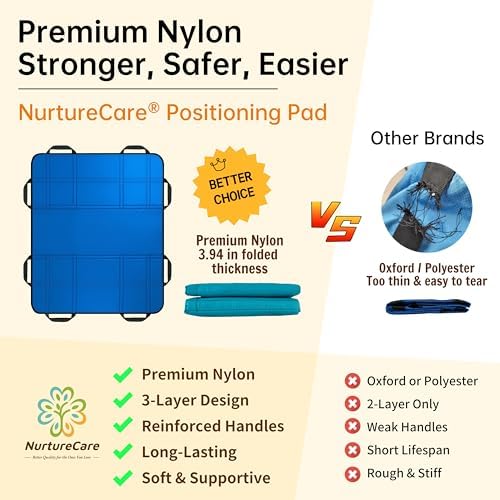 **Enhanced Comfort & Durability: Made with a 3-layer construction, the NurtureCare Positioning Bed Pad offers superior comfort, durability, and waterproof protection. It’s perfect for use with bed moving devices, patient transfer sling, and patient lifter needs, offering a practical solution for bedridden patients and caregivers.