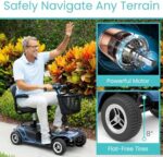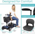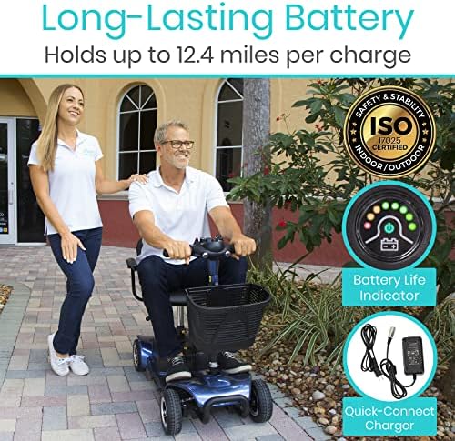SAFELY NAVIGATE SMOOTH SURFACES: Easily maneuver over smooth indoor surfaces and rough outdoor surface with the Vive 4-Wheel Mobility Scooter—with comfort and ease. Designed to safely support up to 265 pounds, the mobility scooter and its tires were engineered for durability and safety. Its easy-grip tires are flat-free, non-marking, and are 8”. Its maximum speed is 3.7 mph, and it has a driving distance up to 12.4 miles per charge.