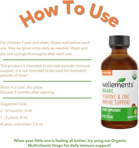 Wellements Organic kids immune support* liquid is a thoughtfully crafted daily supplement made with clean, organic ingredients to help support your child’s natural defenses. Formulated for children 1 year and older, this gentle yet effective blend includes immune-boosting nutrients like Vitamin C, Vitamin D, Vitamin E, and Zinc. These essential vitamins and minerals work together to strengthen the immune system*, promote wellness, and support the body’s natural ability to fight off environmental stressors*. With a naturally sweet orange flavor from organic ingredients and a touch of organic agave syrup, the taste is pleasant and kid-friendly, making it easy for even the pickiest little ones to take daily. The formula is free from unnecessary additives, no preservatives, dyes, parabens, gluten, or GMOs ensuring a truly clean product you can trust. Every ingredient is carefully selected and certified USDA Organic, making this syrup a safe and reliable addition to your child’s wellness routine. Wellements is committed to creating safe, effective, and environmentally friendly products. This immune support syrup comes in a recyclable glass bottle and is produced without the use of synthetic fillers or artificial flavors. It’s easy to administer using the included dropper—simply shake well, measure the correct dose based on age, and dispense toward the inner cheek. Perfect for year-round immune support*, especially during back-to-school season or changes in weather, this syrup gives parents peace of mind and helps kids feel their best. When it comes to your child’s health, trust nature and science to work together in every bottle of Wellements Immune Support.