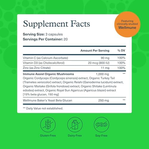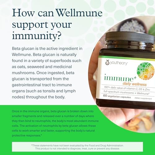 Youtheory Immune+ Daily Wellness – Vegetarian Immune Support Supplement with Vitamin C, Vitamin D3 & Zinc* – Mushroom Supplement with Turkey Tail, Cordyceps & Reishi – 60 Vegetarian Caps